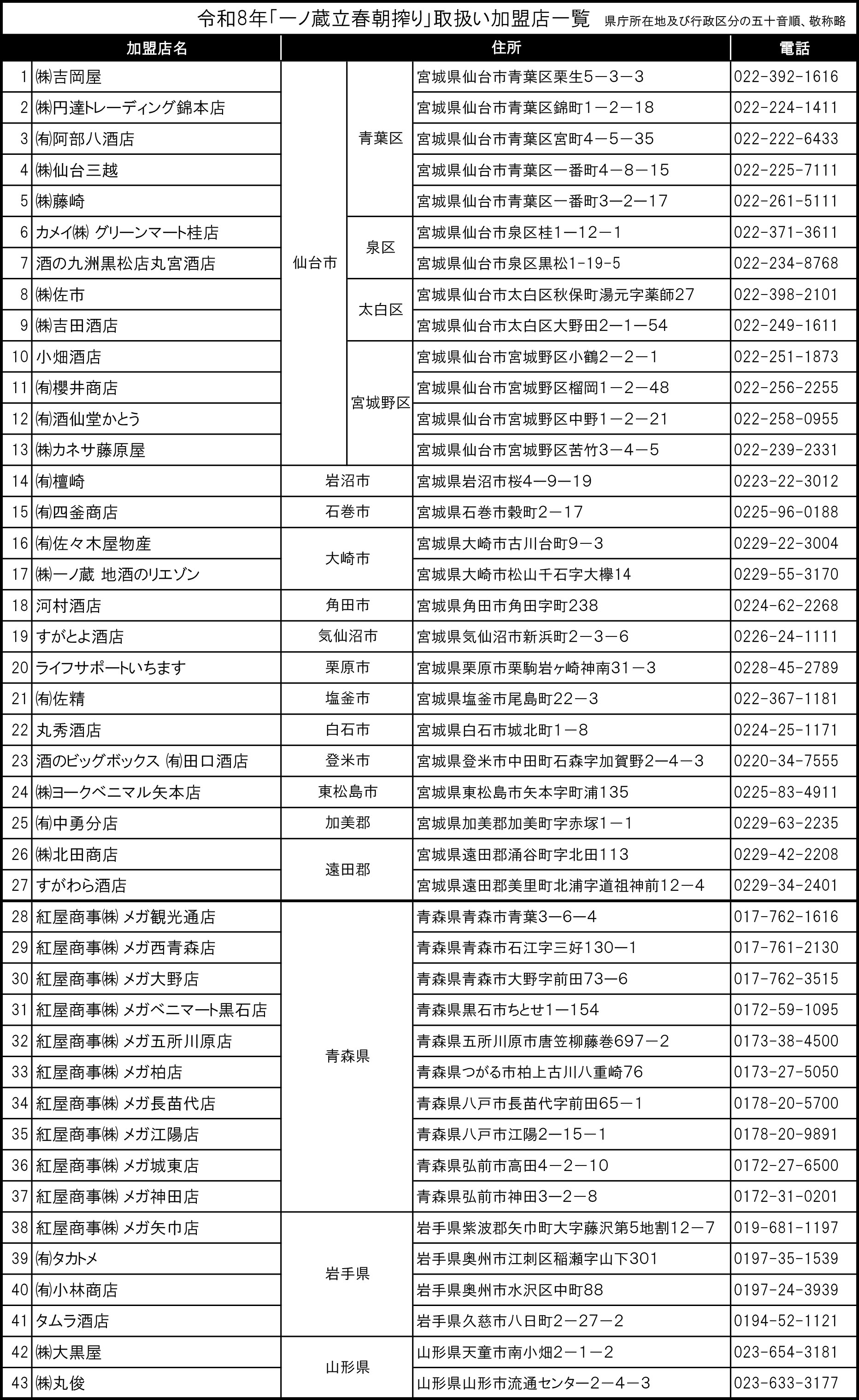 ●販売先:日本名門酒会宮城支部、北東北支部並びに山形支部は一部加盟店